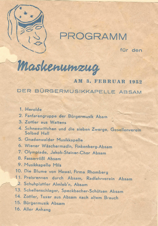 Von den weiteren Gruppen (Preisrennen durch Absam, Liliput-Schuhplattler, Schellenschlager und Zottler) waren es vor allem die Schellenschlager und die Zottlergruppe, die wertvolles uraltes Tiroler Brauchtum zeigten. Den Abschluß bildete die Absamer Bürgermusik.